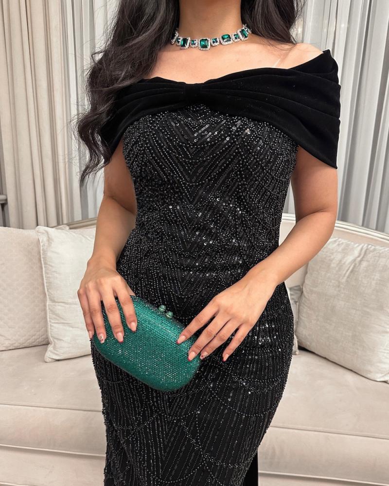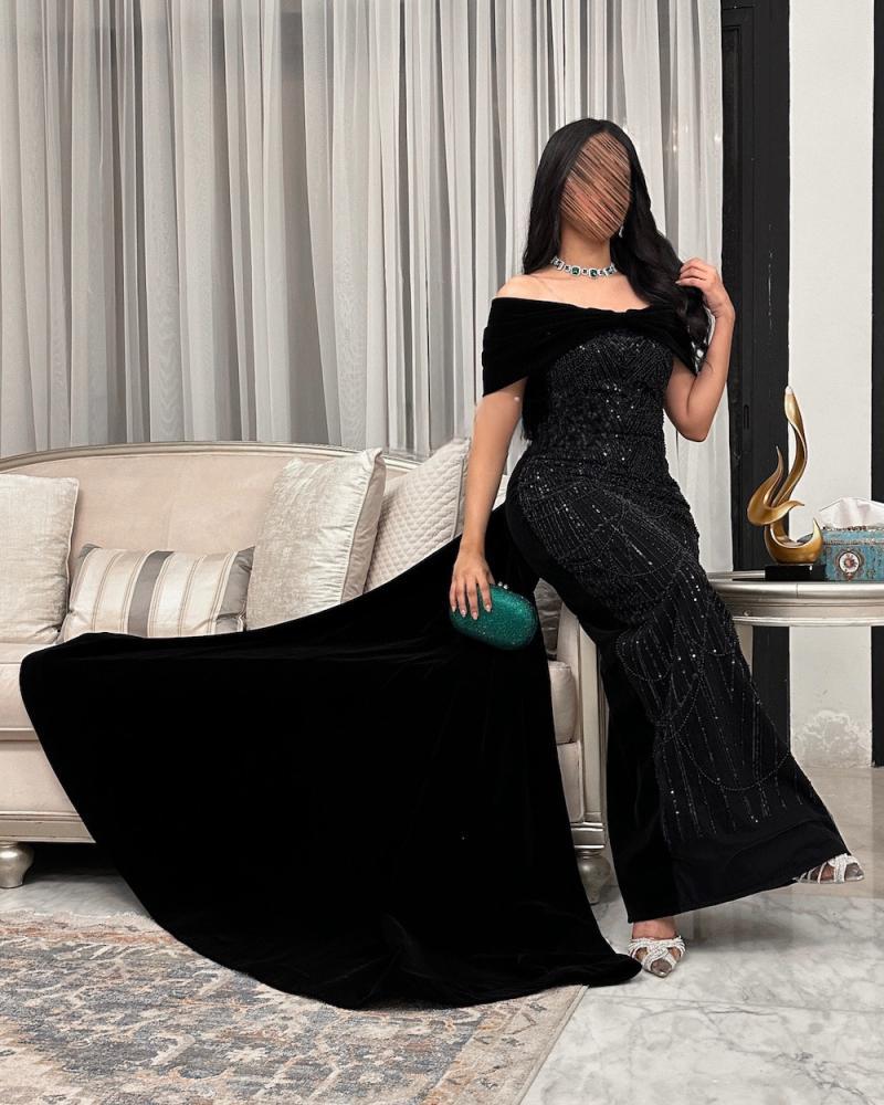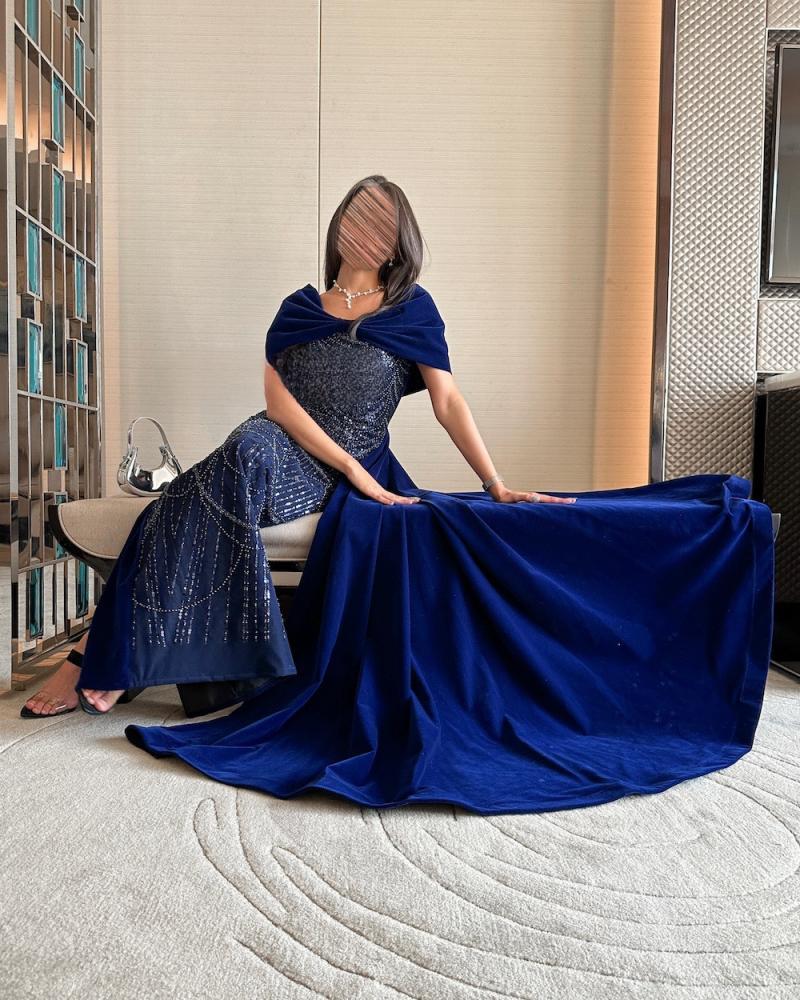 فستان سواريه خامة مخمل أزرق اسود بتفاصيل براقة انيقة متوفر لونين
