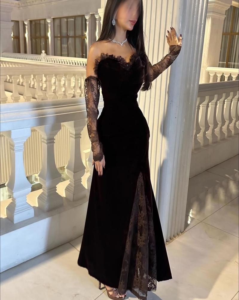 فستان سهرة خامه مخمل باكمام دانتيل مميز
